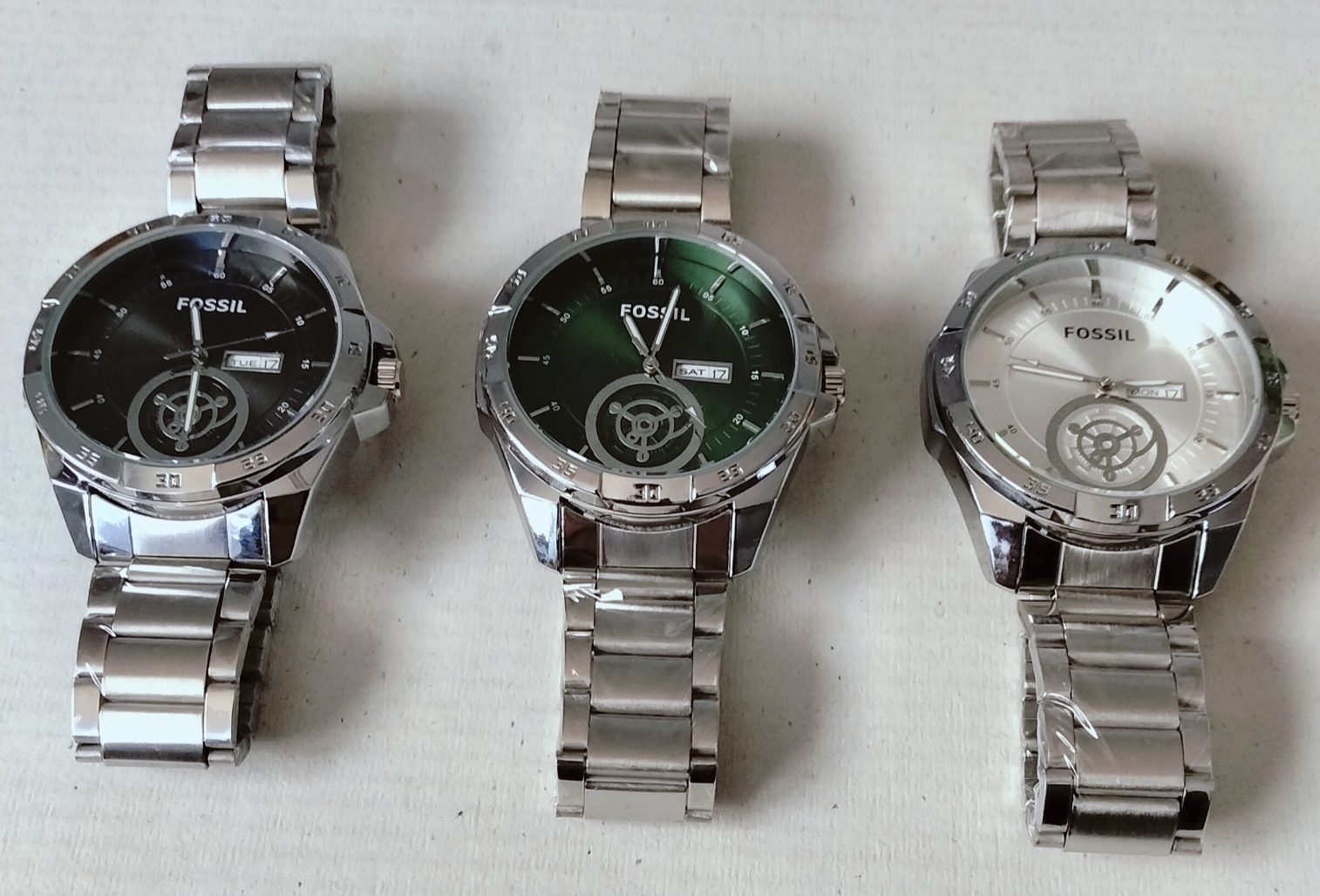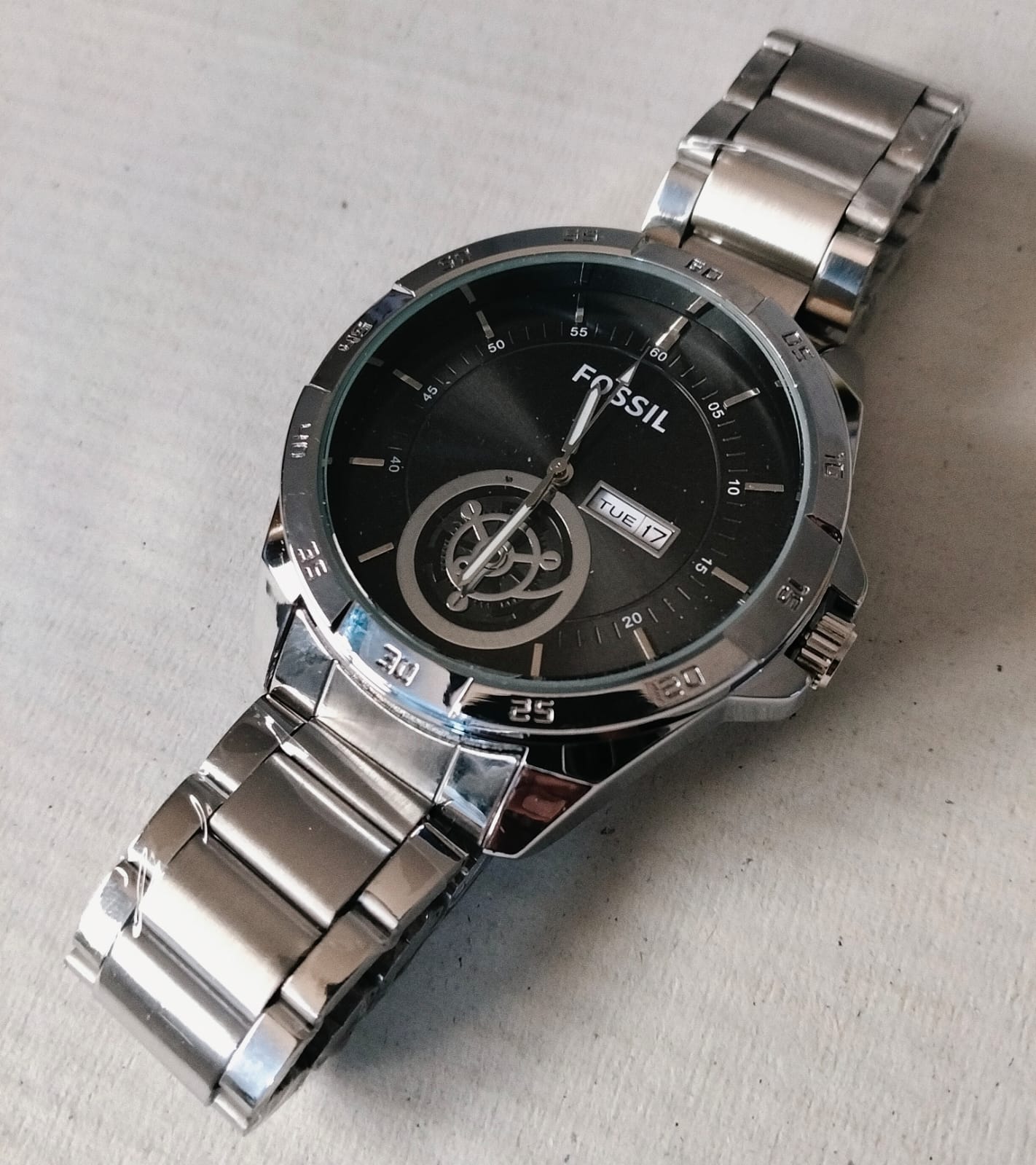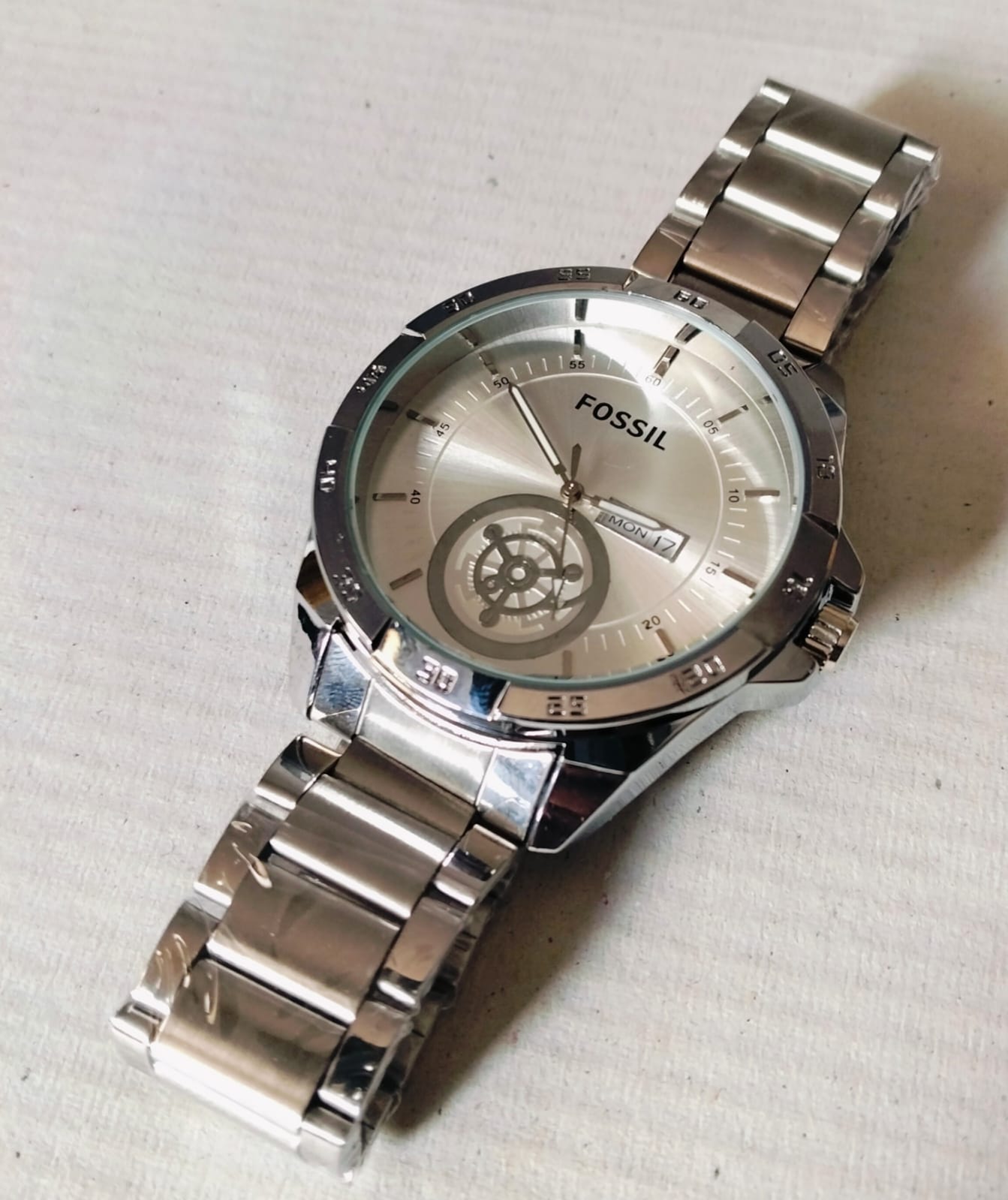 Elevate your everyday style with this classic men’s Fossil-inspired quartz watch. Featuring a timeless round case, the crisp dial showcases a multi-function layout with three sub-dials—displaying day, date, and 24-hour time—complemented by prominent Roman numeral markers and sleek, tapered hands. This timepiece effortlessly balances vintage charm with modern utility, finished with a sturdy, multi-link metallic bracelet and a secure folding clasp for comfortable daily wear.
