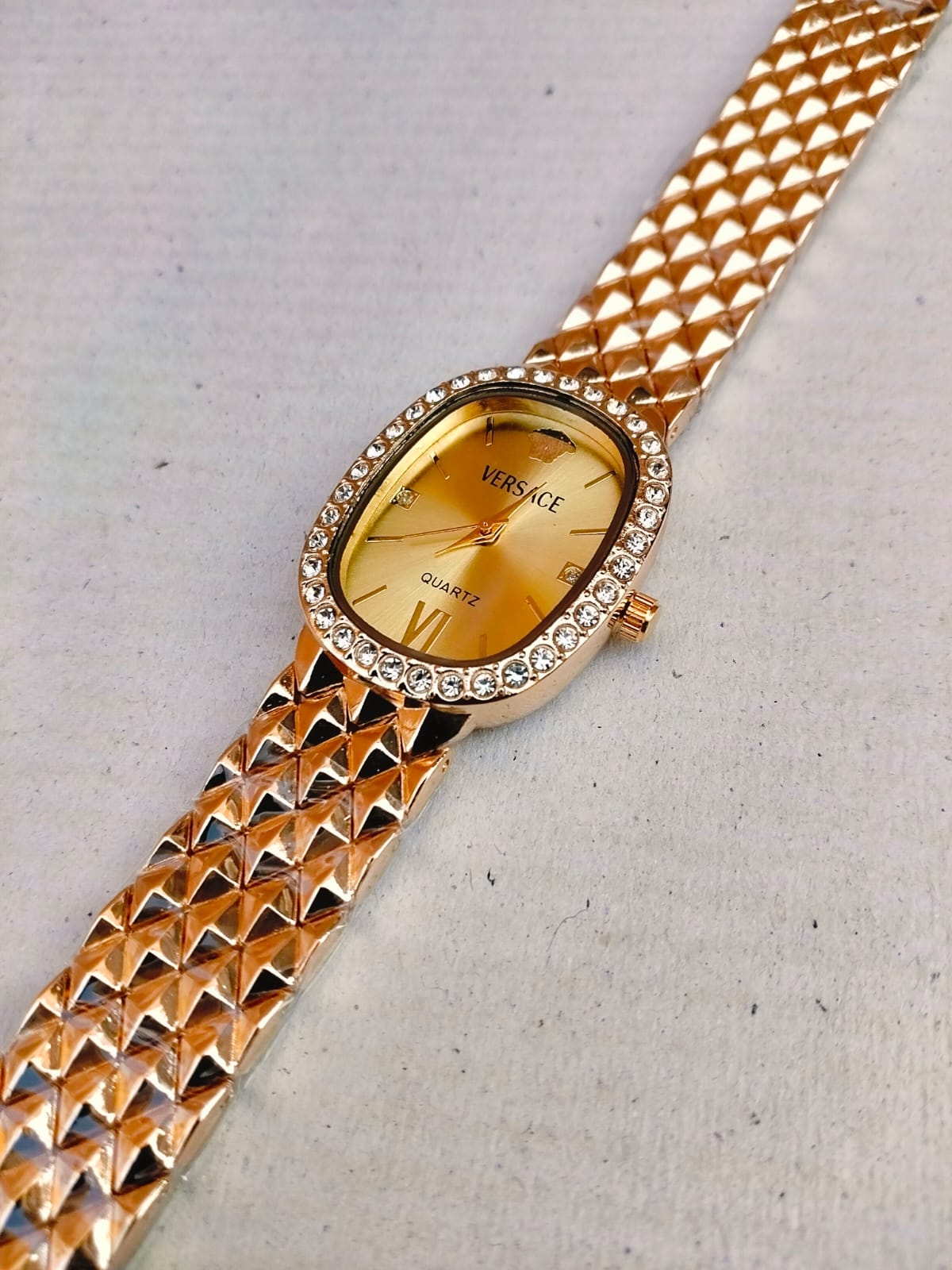Featuring a classic oval face framed by a sparkling, rhinestone-encrusted bezel,