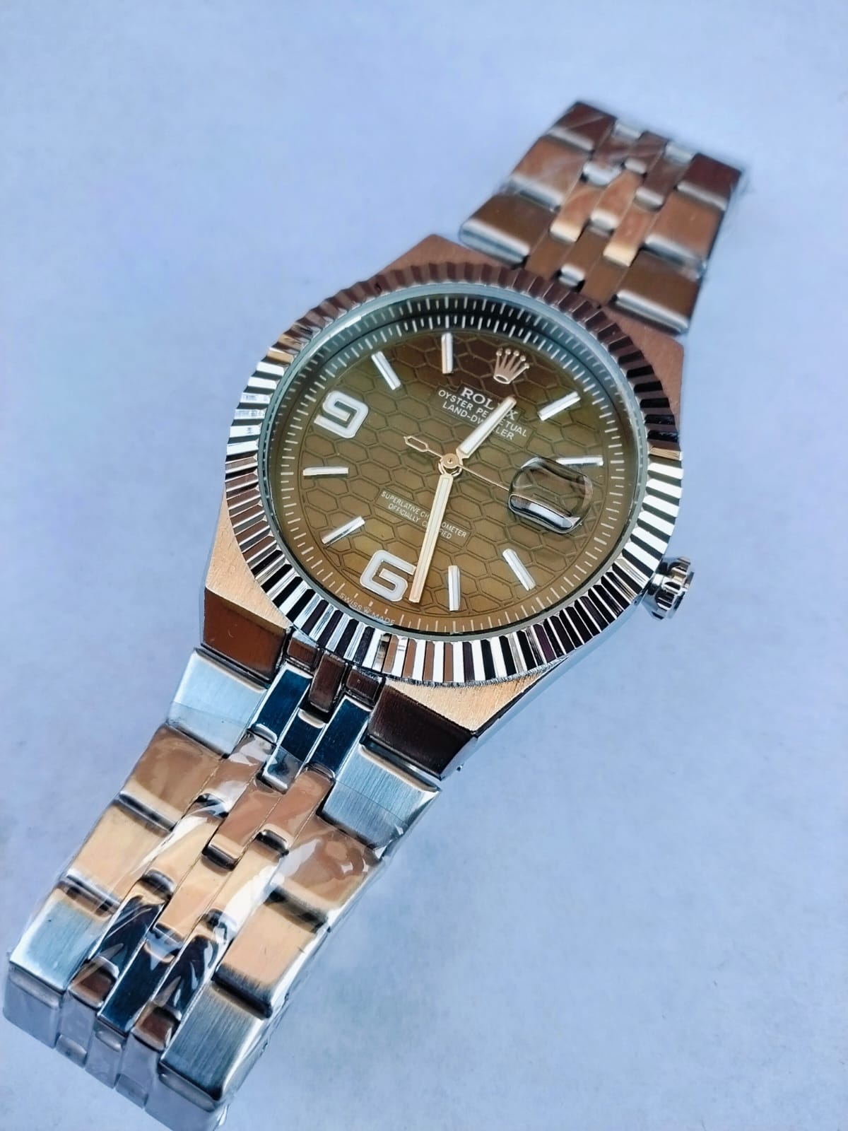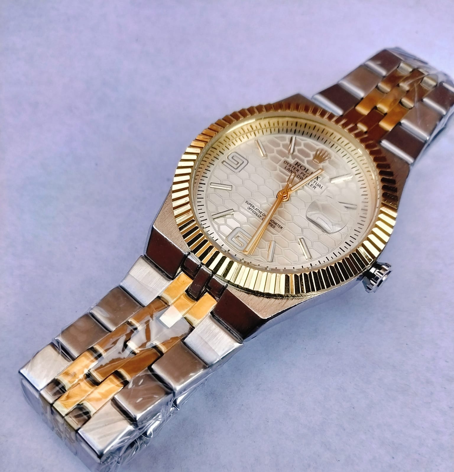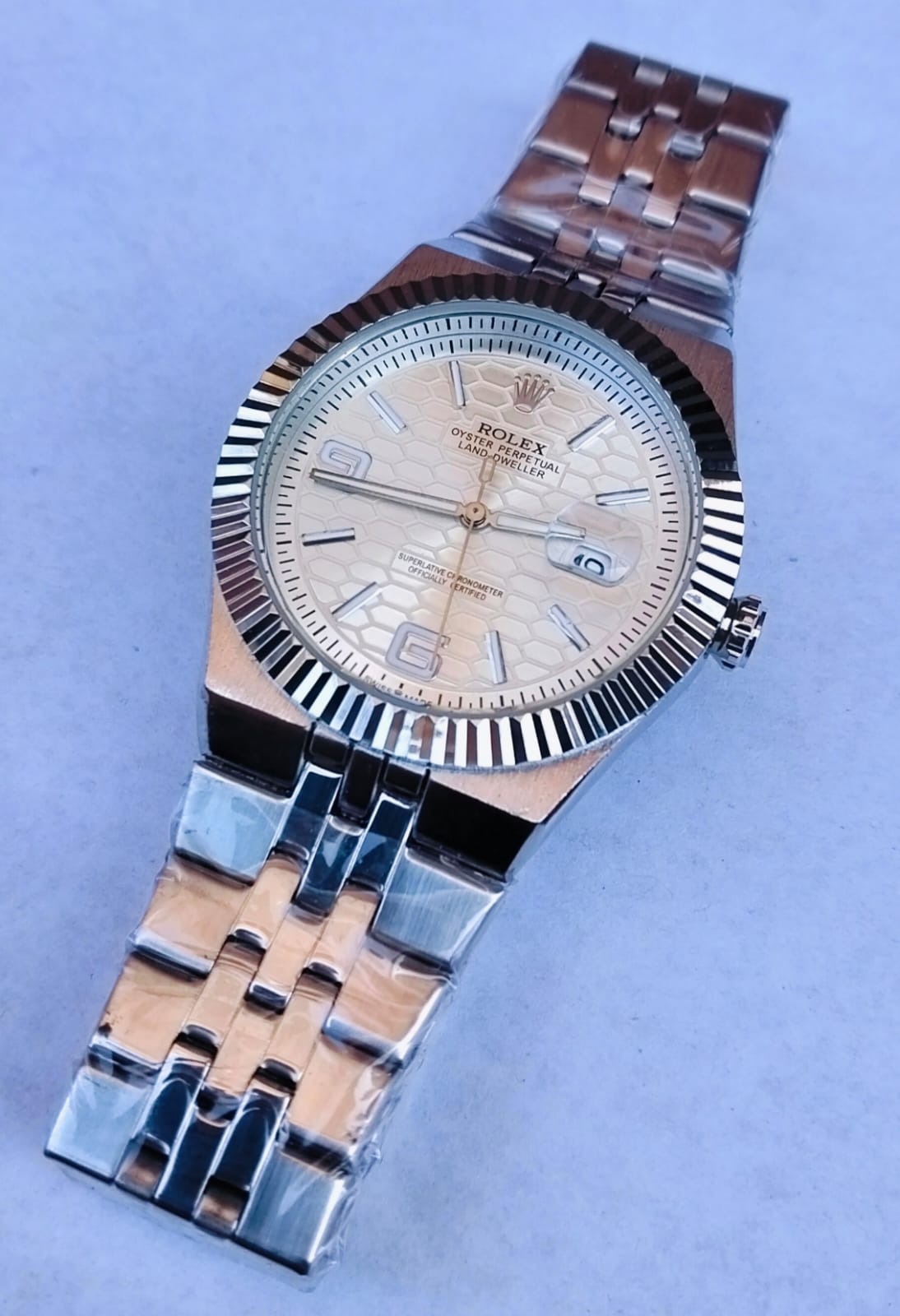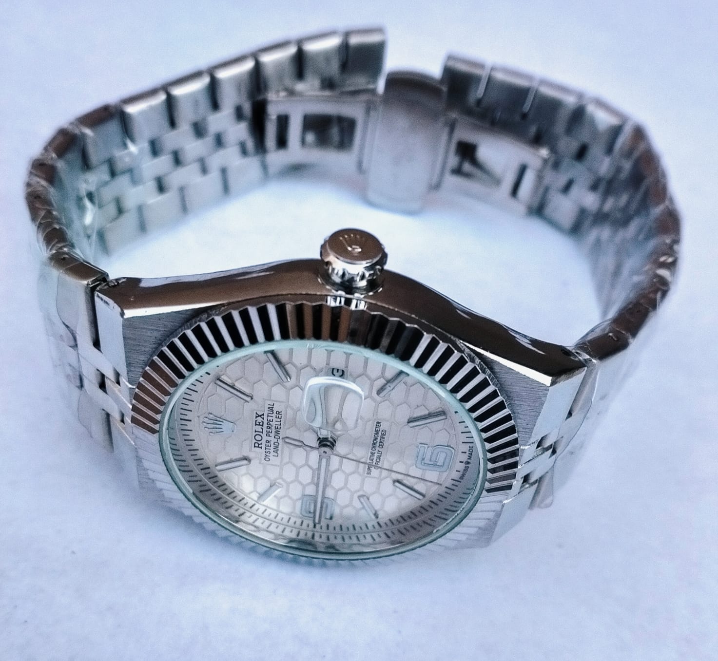 Elevate your everyday style with this classic men’s Rolex-inspired quartz watch. Featuring a timeless round face with a unique honeycomb-textured dial and a signature fluted bezel, this timepiece effortlessly blends sophisticated style with daily functionality. The standout features include a practical date window with a magnifying lens and a polished, multi-link metallic bracelet that provides a secure and sleek finish.